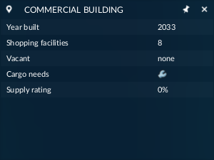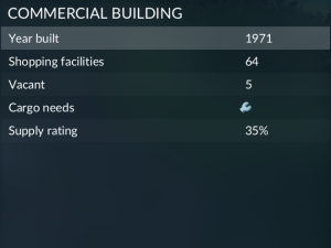 Commercial buildings provide shopping facilities for the people in the game world. The number of maximum shopping facilities in one building depends on the building size. They also have cargo needs, specifically tools, food or goods. The detail window shows the number of facilities that are available in total as well as the number of facilities currently not occupied by a resident. Furthermore there is some information about the cargo type that is demanded and the current supply of this need.