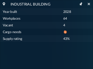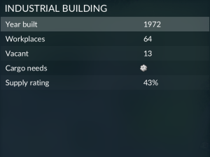 Industrial buildings provide jobs for the people in the game world. The number of maximum jobs in one building depends on the building size. They also have cargo needs, specifically construction materials, machines or fuel. The detail window shows the number of workplaces provided by this building and the number of vacant jobs as well as the supply rate for the cargo.