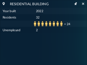 Residential buildings provide living space for the people in the game world. The number of maximum residents in one building depends on the building size. The detail window shows the total number of residents in this building as well as the number of residents that currently have no job and are unemployed. These do not travel to the industrial sector.