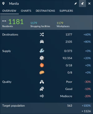 The supply rating indicates for a commercial or industrial building the percentage of the cargo needs currently fulfilled. A high supply rate increases the chance a building will level up.
