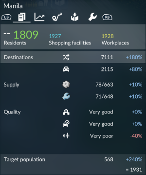 To get an overview over the current situation in the town, select the town name in the world with the inspector or in any list and press to open the town details window. In the top area of the first tab, the current number of residents, shopping facilities and workplaces as well as an overall tendency of growth is shown. Below is a list of all the influencing factors: